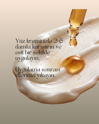 Günlük yüz nemlendiricinizin o günkü kullanım miktarına 2–6 damla ekleyin, karışım homojen hale gelene kadar karıştırın ve temiz cilde eşit şekilde uygulayın.